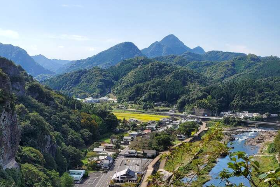 競秀峰(きょうしゅうほう)は、耶馬溪でも屈指の名勝です。 この奇景に魅せられて、この里に骨を埋めた小野桜山のような人物もいます。その景観は、樋田側から一・二・三の峰、恵比須岩・鬼面岩・大黒岩・妙見岩・殿岩・釣鐘岩・陣の岩・八王子岩など集塊岩の巨峰、奇岩群が約1キロにわた って連なっています。 競秀峰を観るには、青の洞門をくぐり抜けて、岩肌にふれながら直下から振り仰ぐ方法や山国川のほとりから見学するほか、山腹を巡る競秀峰探勝道からもその美しさを満喫できます。