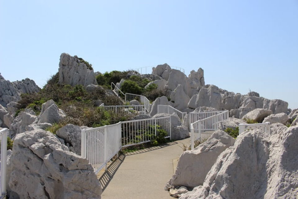 ダイビングやオートキャンプ場(要予約)を兼ね備えた観光施設。公園全体が白い石灰岩で囲まれ、青い海と氷山のような白い岩のコントラストが美しく、周囲は豊かな自然に恵まれています。この石灰岩は、2億5千万年前の古生代ペルム紀のもので、『フズリナ』や『ウミユリ』の化石を確認できます。